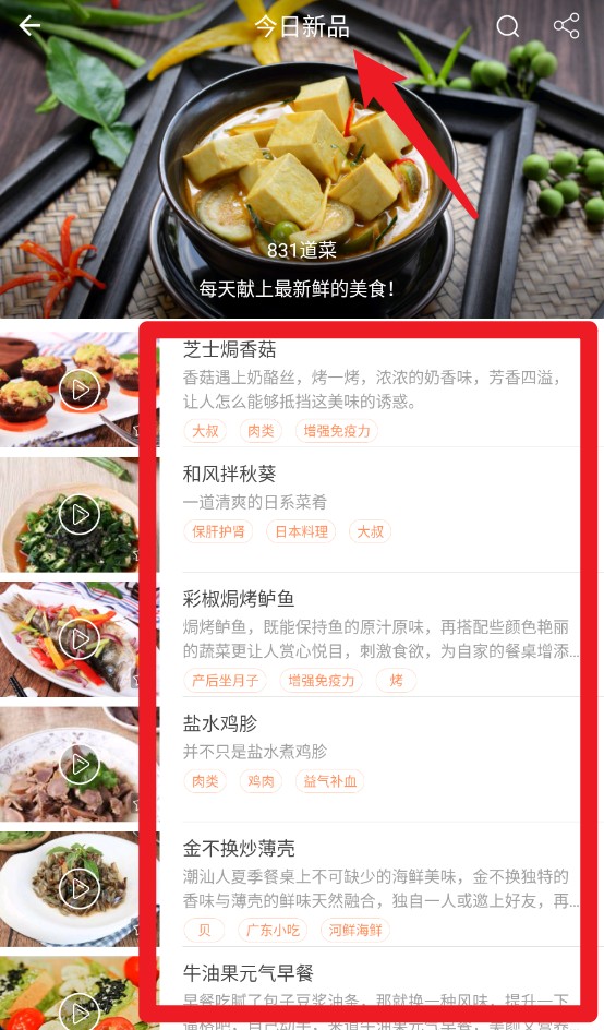 3、进入今日新品详细页面后,可浏览每日更新菜谱,配图加标签帮助用户快速了解菜品特色与功效。