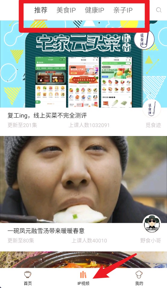 5、IP视频频道分为推荐、美食IP、健康IP及亲子IP等分类,点击底部IP视频进入相关内容。