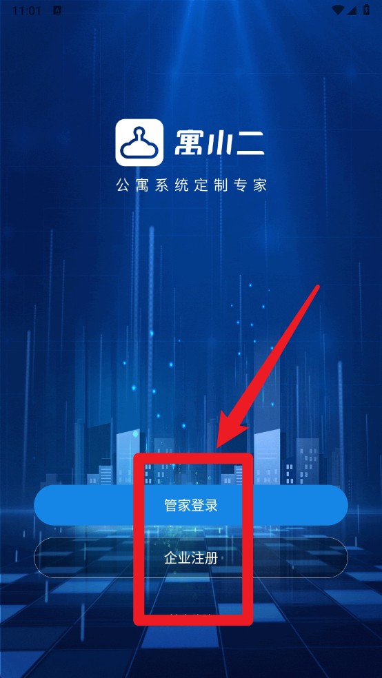 1、打开App之后,首页点击管家登录或企业注册进入身份验证界面。