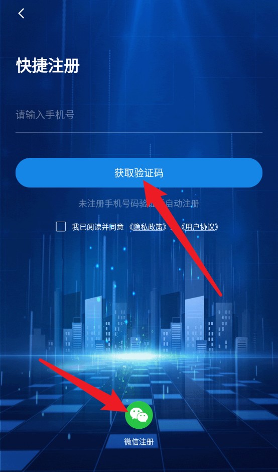 2、在注册页面输入手机号获取验证码,或选择下方微信注册快速完成账号创建。