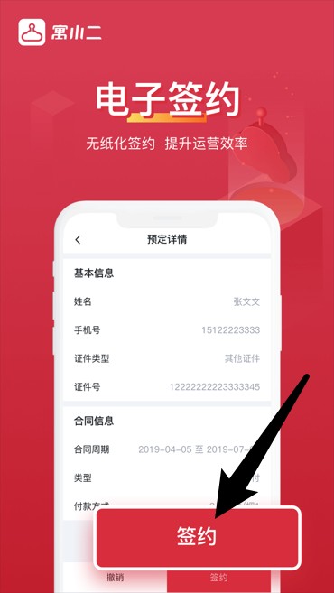 4、点击预定详情中的签约按钮,在线完成电子合同签署,提高运营效率。