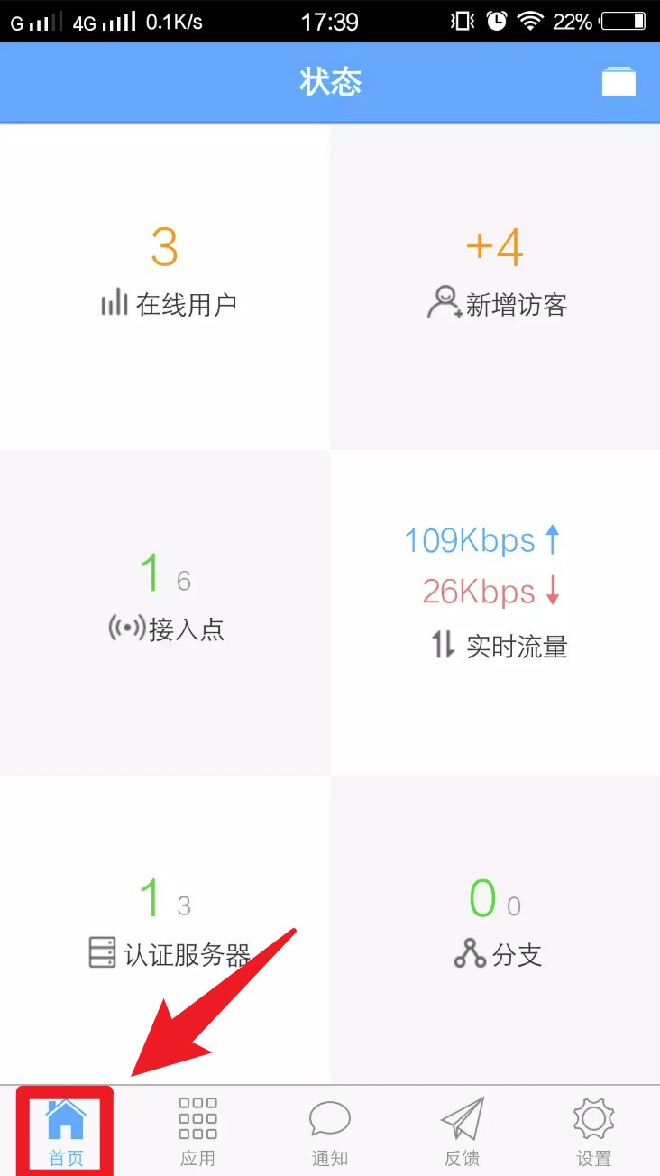 1. 打开App默认停留在首页,可查看当前在线用户数、新增访客数与实时流量状态。