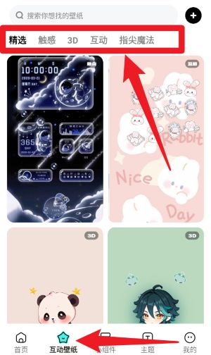 3、切换到底部互动壁纸栏目后,可在顶部选择触感、3D、互动、指尖魔法等类型浏览创意互动壁纸。