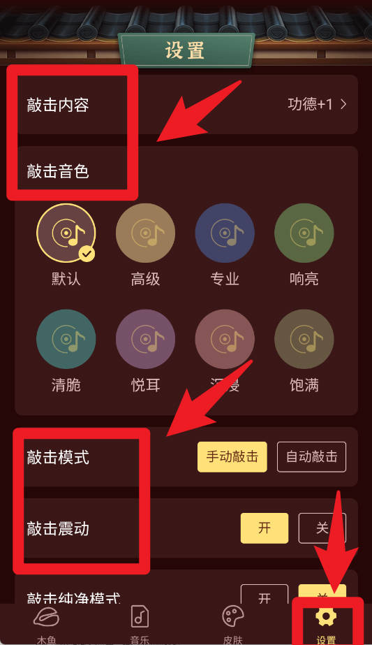 4、在设置界面中可选择敲击内容、音色、模式及震动效果,自由组合打造专属体验。