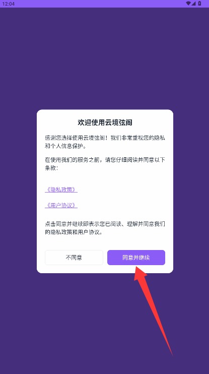 1、初次使用需阅读用户协议与隐私政策,确认无误后点击同意并继续按钮进入。