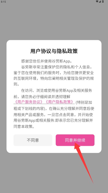 1、初次使用需阅读用户协议与隐私政策,确认无误后点击同意并继续按钮进入。