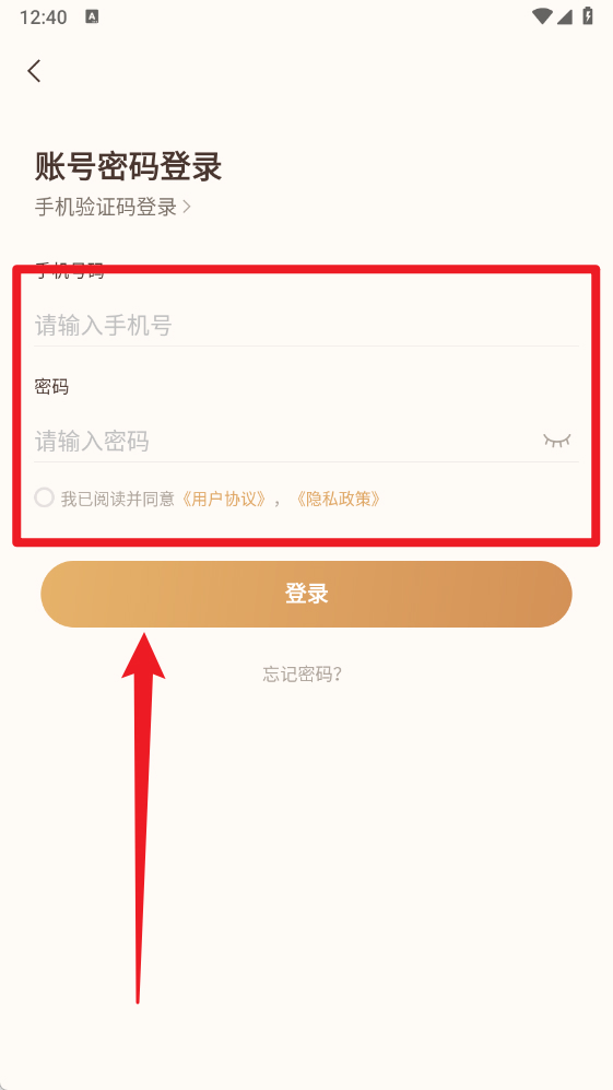 1、在账号密码登录界面输入手机号和密码,勾选同意用户协议和隐私政策后点击登录,即可进入系统。