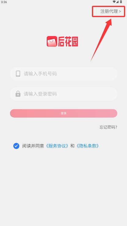 2、在登录界面,点击右上角的注册代理功能入口,跳转至账号注册操作界面。