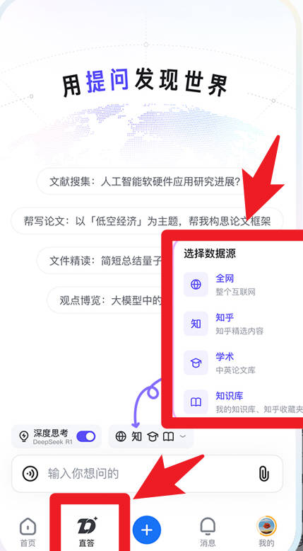 2、在直答界面,用户能够选择全网、知乎、学术和知识库等不同数据源进行提问,快速获取全面而精准的答案。