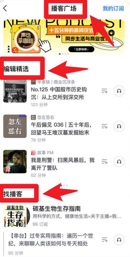 3、在播客广场,用户可以查看编辑精选内容,还能通过找播客功能订阅和收听更多优质音频节目,丰富日常学习。