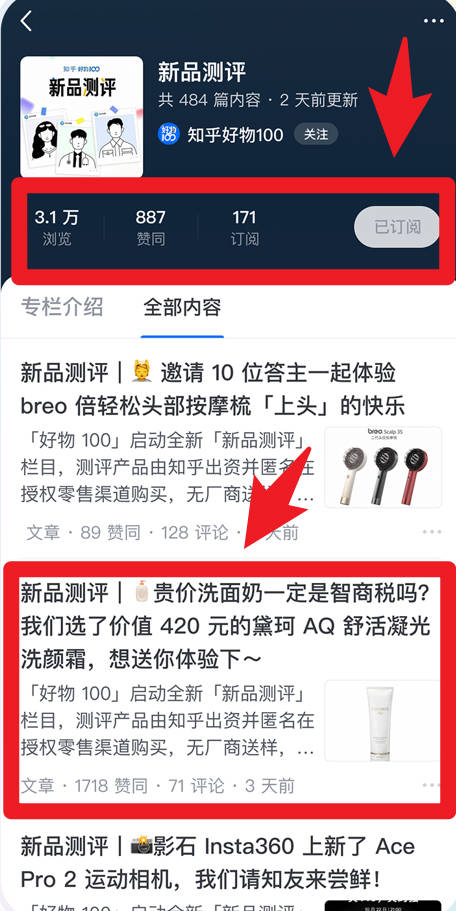 4、在专栏订阅详情页,用户可查看浏览量、点赞数和订阅量,阅读具体文章,了解产品测评和相关深度内容。