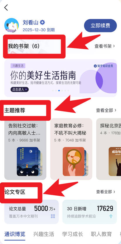 5、于个人主页,用户能进入我的书架、查看主题推荐和论文专区,系统会根据兴趣推荐合适的书籍与学术资料。
