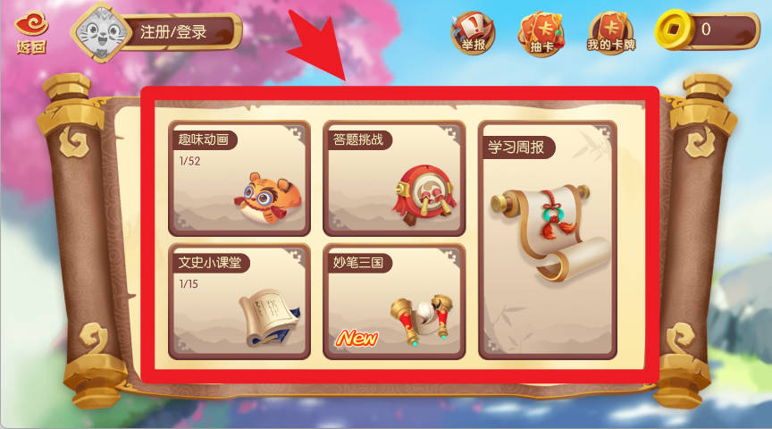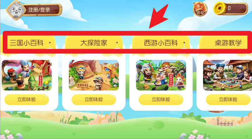 2、在首页可以选择三国小百科、大探险家、西游小百科或桌游教学等栏目,进入不同的学习体验模块。
