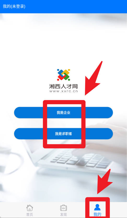 1、在我的界面用户可选择我是企业或我是求职者两种身份登录,进入前需确认账号类型以便获得对应功能服务。