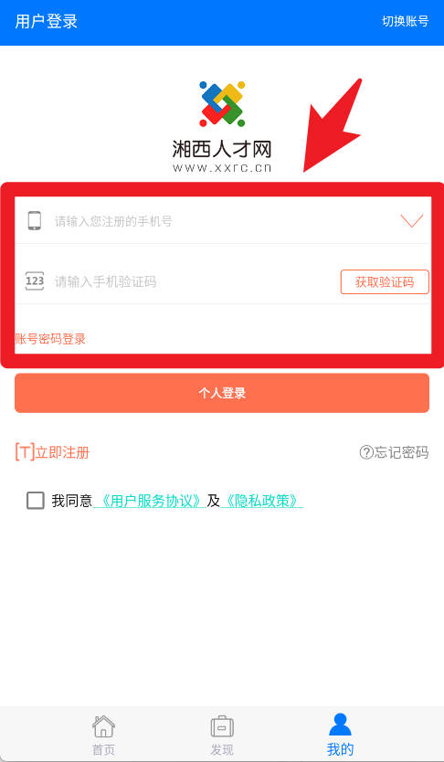 2、在用户登录页面输入注册手机号并获取验证码完成验证,也可选择账号密码方式登录。