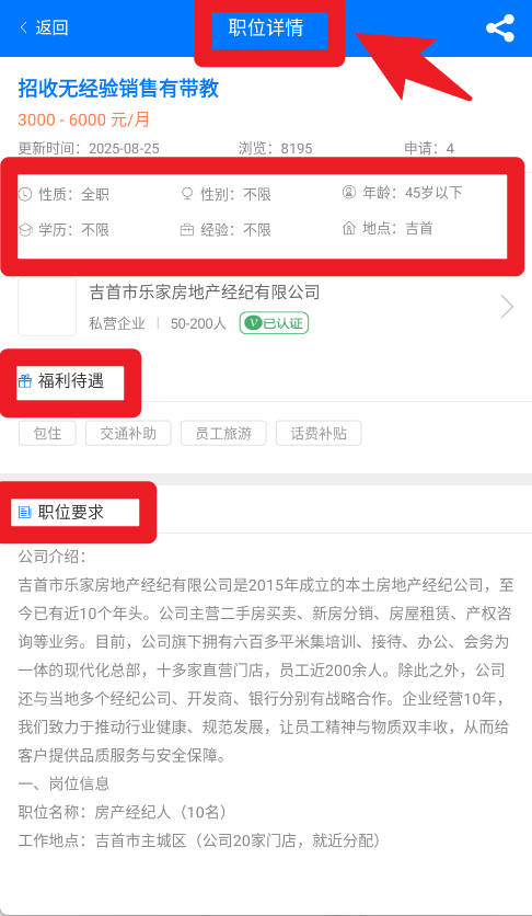 4、在职位详情页面可查看岗位性质、性别年龄、学历经验和工作地点等要求,还能浏览福利待遇和详细职位说明。