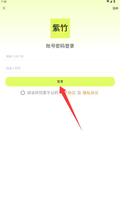 2、返回登录界面,输入用户名和密码,勾选同意平台协议后点击登录进入。
