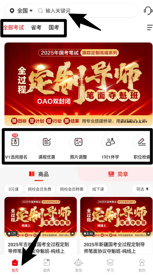 1、首页可通过搜索栏查找考试信息,并切换全部考试、省考、国考等分类,同时在功能区进入选岗报名、课程优惠、照片调整等服务。