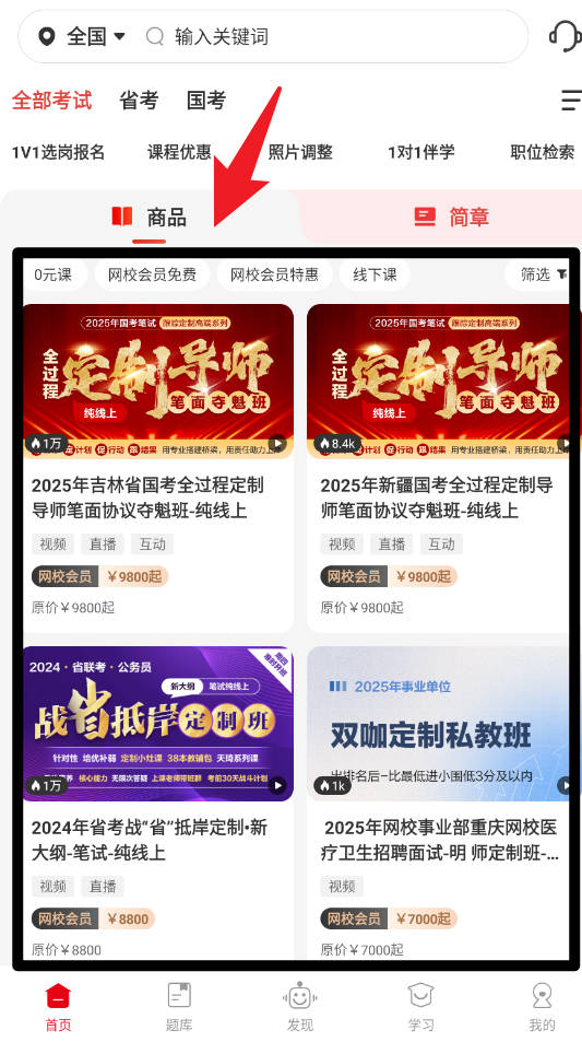 2、点击首页的商品栏目,可浏览各类培训课程,支持按照免费课程、会员特惠、线上课程等分类查看,并显示课程价格与报名人数。