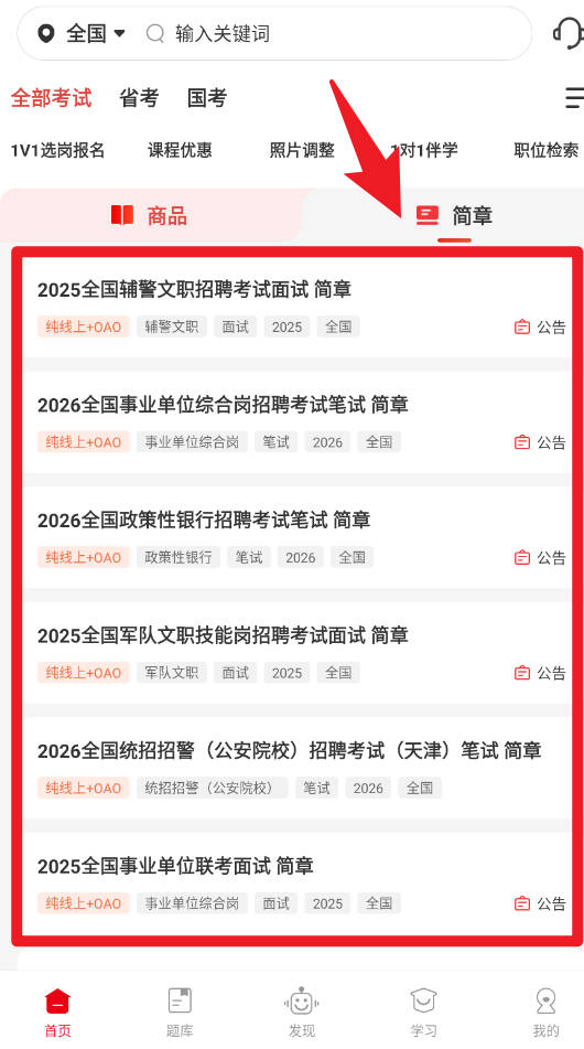 3、点击首页的简章栏目,可查看全国各类招聘考试的考试简章,包括考试类别、时间、公告性质等详细信息。