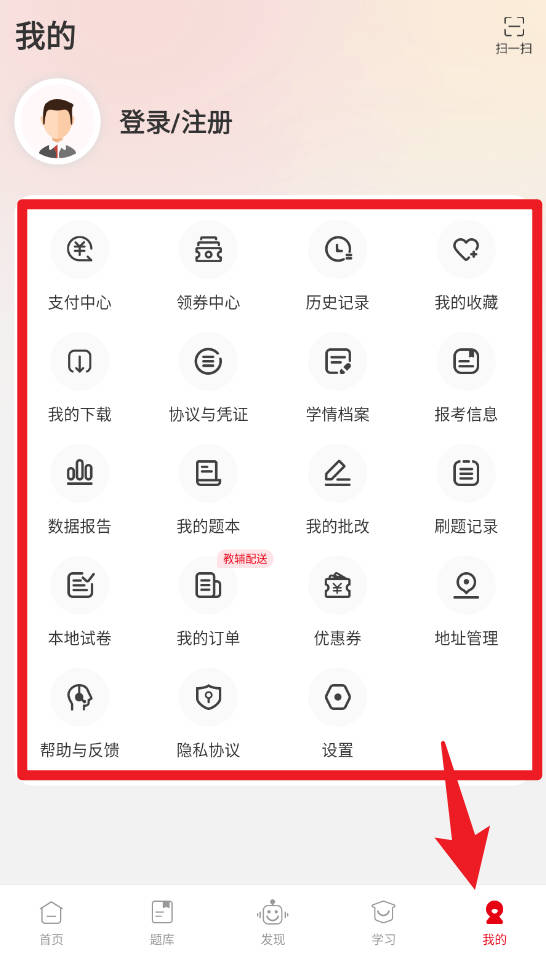 5、在我的界面,用户可登录或注册账户,并管理支付中心、领券中心、历史记录、收藏、下载、学籍档案、报考信息、订单、优惠券等个人信息。