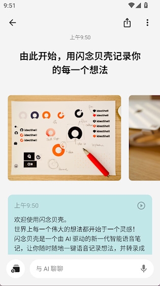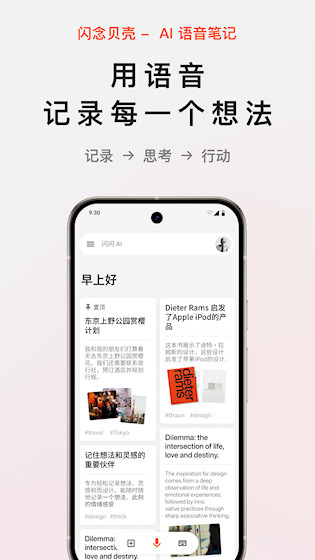 闪念贝壳是一款语音笔记应用,通过语音快速记录日常灵感、想法或事务,内置语音转文字功能,快速变成结构化的文字信息,在不依赖手动输入的前提下,帮助人们高效捕捉稍纵即逝的念头,降低记录门槛,提升信息处理效率。