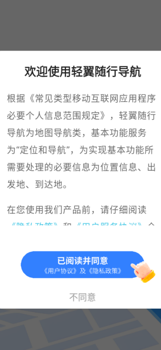 1、下载安装轻翼随行导航app后,首次打开需快速勾选用户协议,即可顺利进入应用主界面