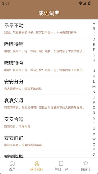 2、“成语词典”界面可以按拼音首字母顺序查找成语