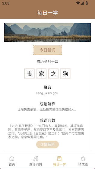 成语字典是一款成语学习应用,适合各个年龄段的人群使用,收录了大量常用与生僻成语,每条成语都配有详细的释义、出处、用法说明和相关例句,帮助使用者准确理解与恰当运用,支持多种查询方式,便于快速查找所需内容,是语文学习和日常语言积累的好帮手。