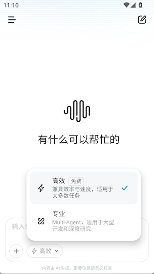1、在下方输入框输入文字进行对话,能切换高效/专业模式