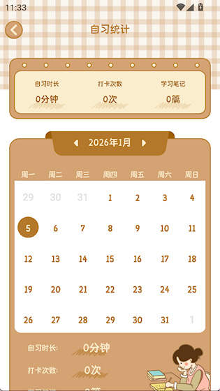 4、点击自习统计能看到自己的自己时长、打卡次数等