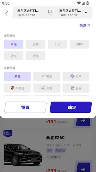 1、车型多样选择:提供多种中高端品牌车型,包括豪华轿车、SUV、商务MPV和新能源车,满足不同出行场景下的用车偏好与实际需求。