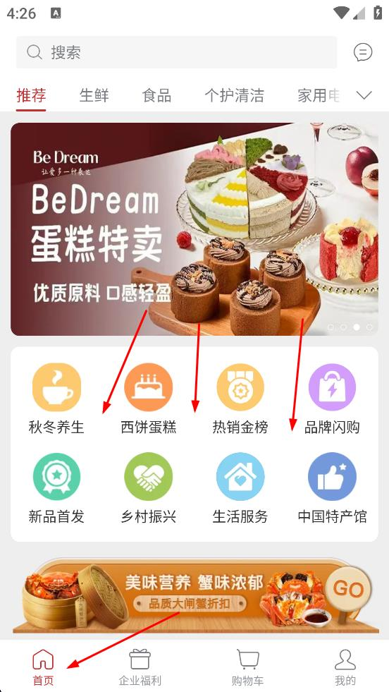 1、首页可通过搜索功能查找商品,也可选择推荐等分类浏览;点击西饼蛋糕等入口直达专属专区,浏览banner图可获取最新优惠信息。