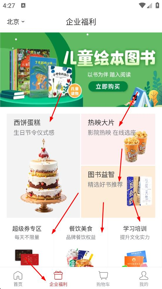 2、企业福利页设有儿童绘本等推广内容,划分西饼蛋糕、热映大片等分类,可按需选择获取对应福利资源。