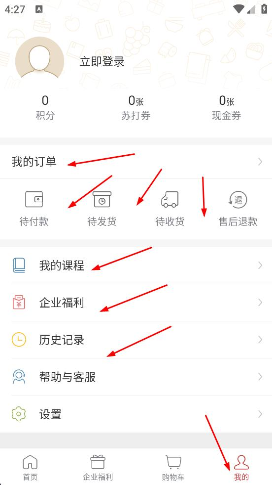 4、我的页面需先完成登录,可在此管理订单、课程及企业福利,查询历史记录、联系客服,通过设置优化使用体验。