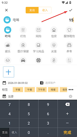 2、提供了丰富的收支分类选择,可以添加图片,输入金额与备注后点击完成