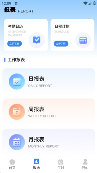 3、报表页面整合多重实用功能,包含考勤日历、日程计划、日报表、周报表及月报表,满足多元统计需求。