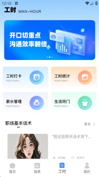 4、工时页面涵盖工时打卡、工时统计、薪水管理等核心功能,同时提供生活窍门与职场基本话术等实用内容。