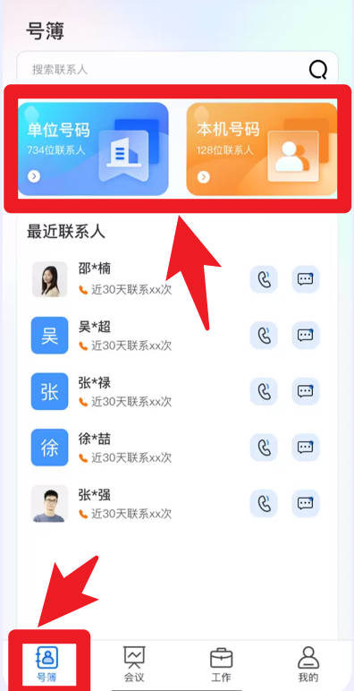 1、号簿页面:可快速切换查看单位号码与本机号码,清晰区分企业通讯与私人通讯;支持搜索功能,精准查找联系人。