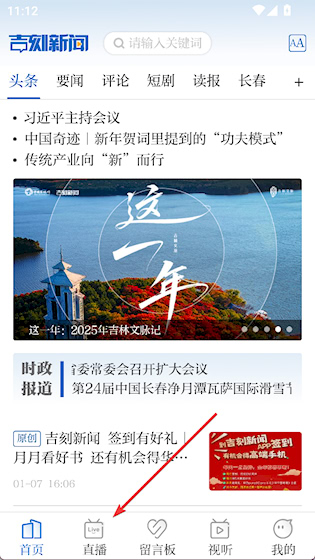 1、打开吉刻新闻APP,点击导航栏的“直播”
