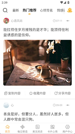 1、首页有多个栏目,带来热门语录推荐