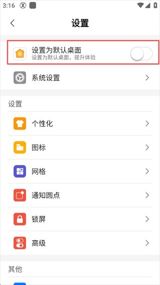 4、在设置中找到【设置为默认桌面】选项并开启,按照提示完成操作。