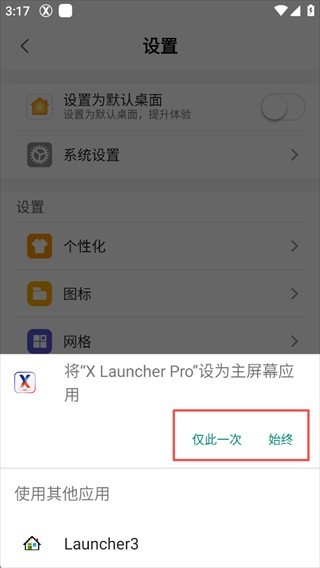 5、在弹出的选择框中点击 “仅此一次” 或 “始终”,选定 XLauncher Pro 即可生效。