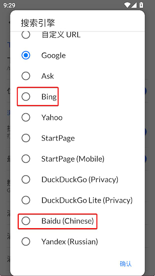 3、选择 bing 或 baidu 可以正常搜索