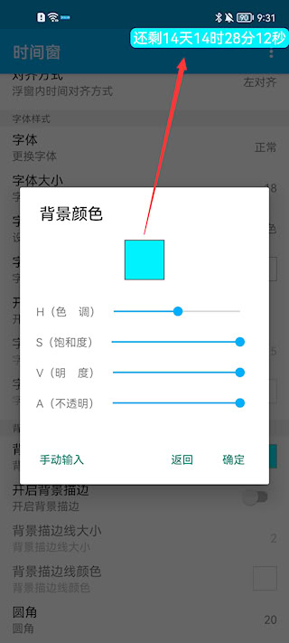 5、最后点击“背景颜色”选项,自由调节色相与明暗深浅,使时间窗更醒目或更融入整体界面风格。