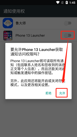 3、如选择启用通知权限,点击“Agree”后将自动跳转至系统设置页,在“通知使用权”中为模拟器开启对应权限即可。