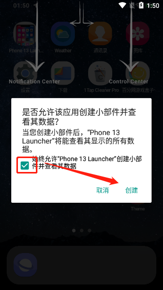5、首次进入模拟主屏时,系统会提示是否允许创建桌面小部件并读取相关数据,勾选“允许”后点击“创建”完成初始化。