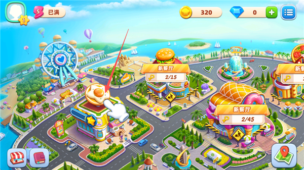 4、在世界各地烹饪美味!、解锁关卡店铺提升厨艺,环游世界成为顶尖厨神。