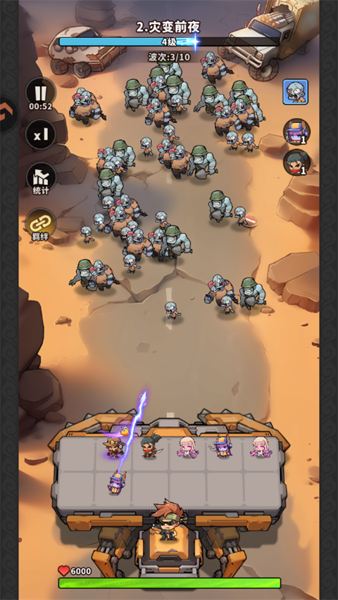 2、实时割草战斗:进入关卡后自动战斗,勇士自动攻击来袭丧尸,玩家通过升级选择强化英雄或技能,动态调整战术走向。