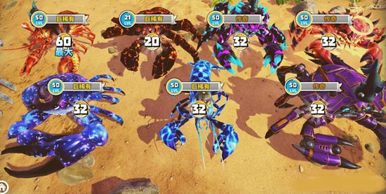 1.螃蟹的作战实力会随战斗力数值提升同步增强,体型也会随之变大,解锁钳子、硬壳等不同类型的专属作战武器,向对手发起猛烈攻击。